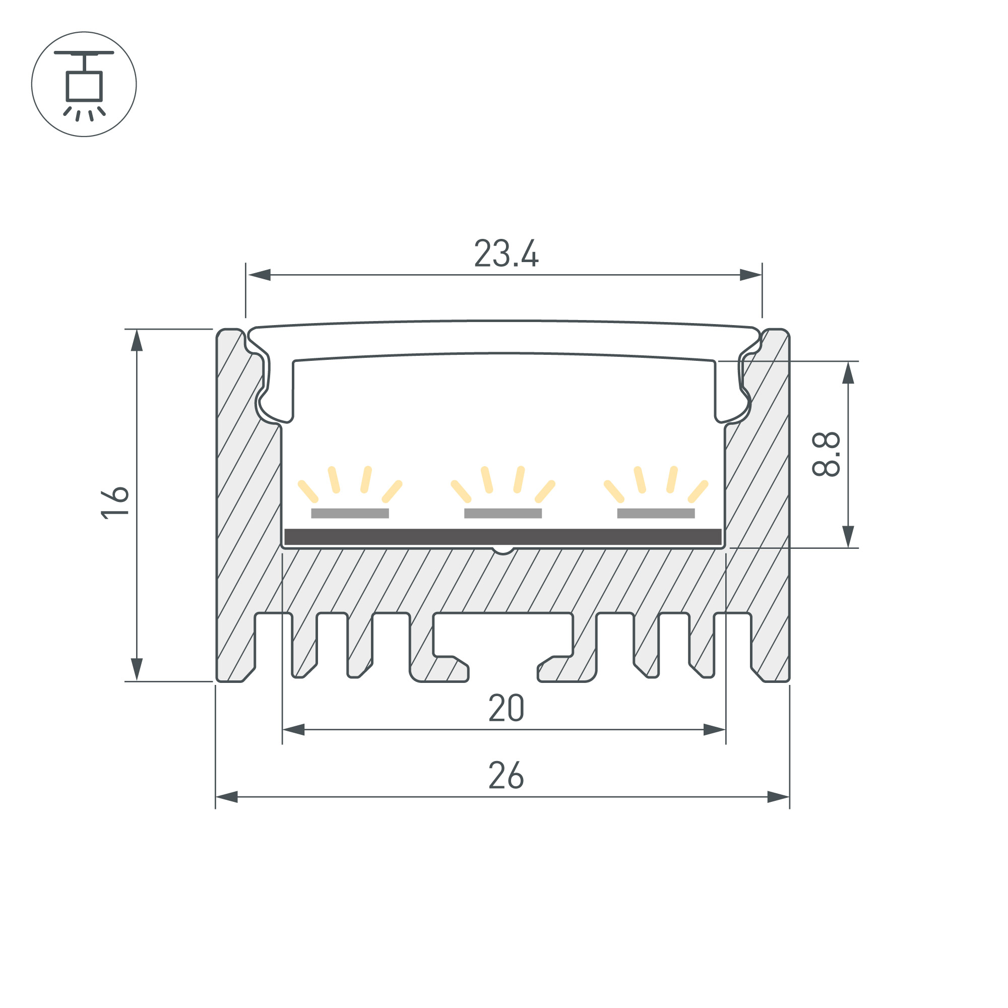Подвесной профиль из анодированного алюминия для контурной подсветки элементов интерьера. Габаритные размеры профиля составляют 2000 мм в длину, 26 мм в ширину и 16 мм в высоту. Площадка для установки светодиодных лент позволяет использовать ленту шириной до 20 мм и мощностью до 22 Вт/м. Это обеспечивает гибкость в выборе светодиодных лент и создает потрясающие световые решения.