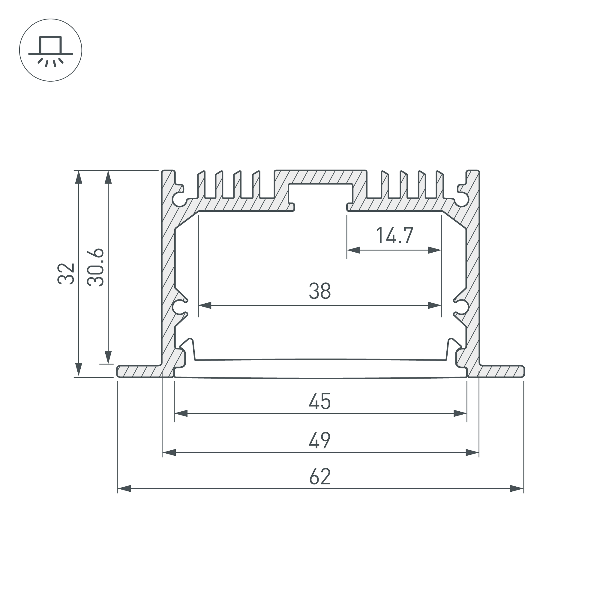 Комплект с экраном. Алюминиевый профиль для светодиодных лент и линеек. Цвет - черный RAL9005 (порошковая окраска). Габаритные размеры (L×W×H): 2500x62x32 мм, паз для установки 49 мм. Ширина площадки для ленты 38 мм. Аксессуары приобретаются отдельно. Цена за комплект: профиль - 2,5 м, экран - 2,5 м, глухая заглушка - 2 шт.