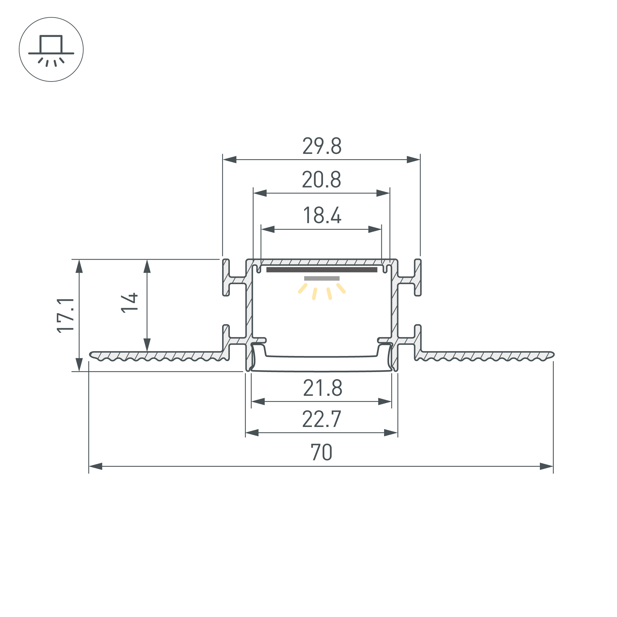 Алюминиевый встраиваемый профиль для светодиодных лент и линеек. Габаритные размеры (L×W×H): 2000х70х17.1 мм. Ширина площадки для ленты 17 мм. Экраны, заглушки и другие аксессуары приобретаются отдельно. Цена за 1 метр.