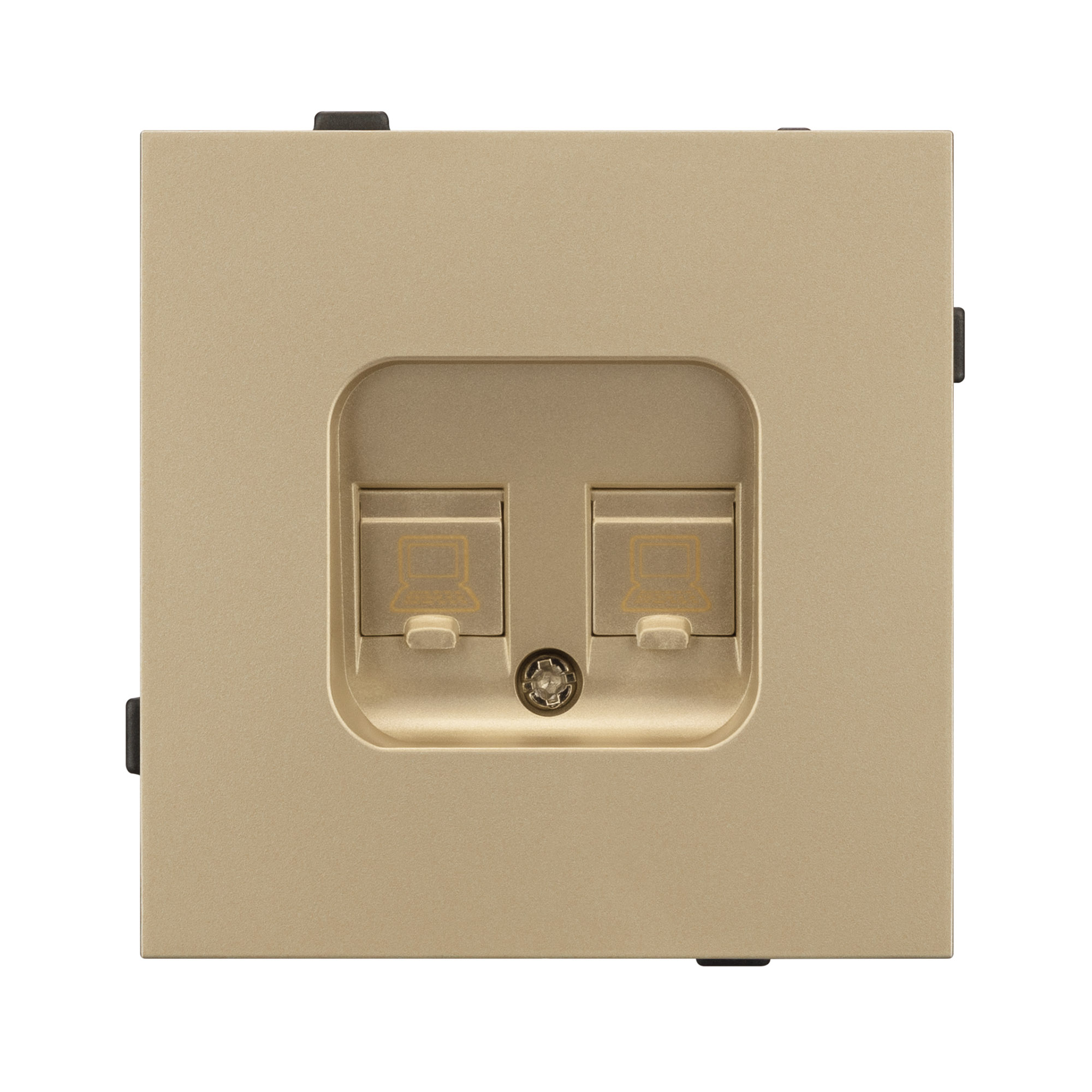 Механизм компьютерной розетки на 2 поста 6-й категории. Цвет - золотой, с Soft-Touch покрытием. Без фронтальной рамки. Уровень пылевлагозащиты IP20. Розетка устанавливается в стандартный подрозетник круглого сечения диаметром 60мм. Габаритные размеры: длина 71 мм, ширина 71 мм, высота 42 мм. Гарантийный срок 10 лет.