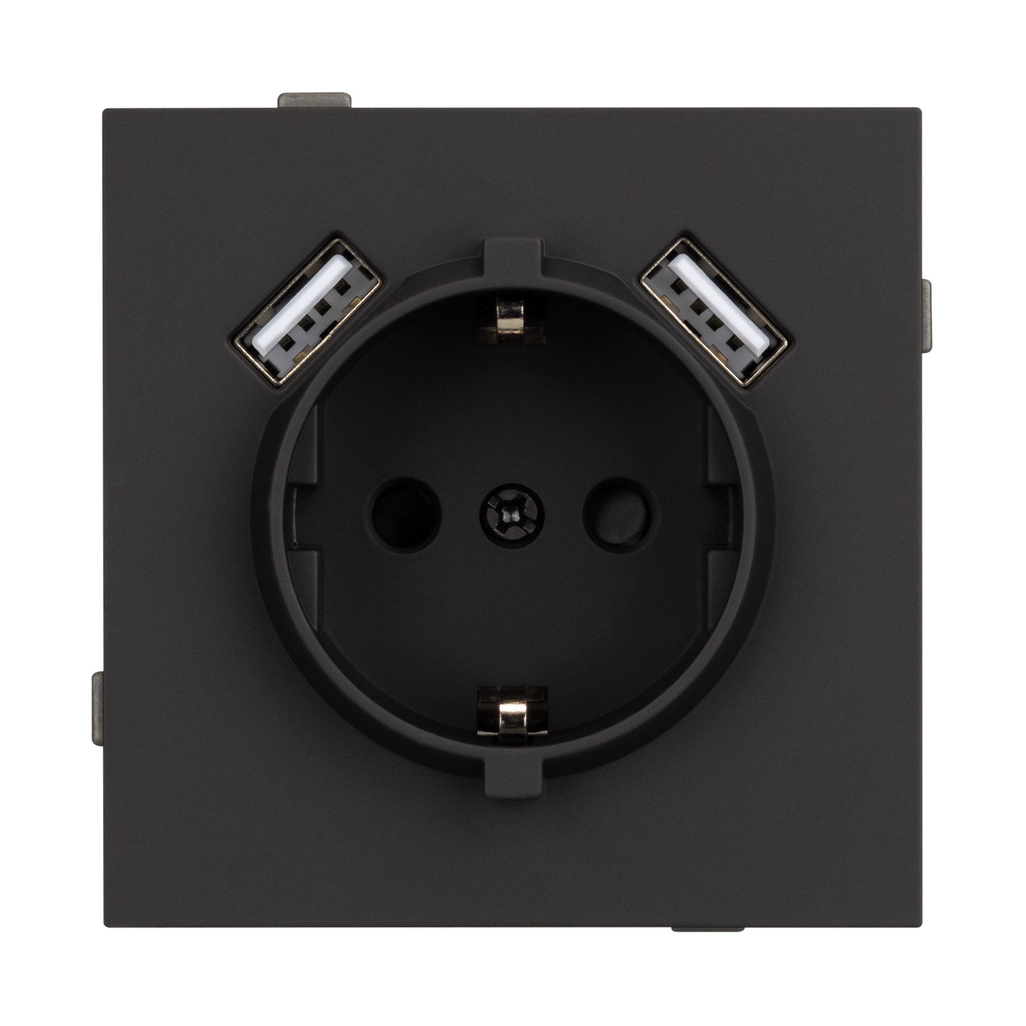 Механизм розетки с заземлением на 1 пост и 2USB Type A порта. Цвет - черный, с Soft-Touch покрытием. Без фронтальной рамки. Уровень пылевлагозащиты IP20. Розетка устанавливается в стандартный подрозетник круглого сечения диаметром 60мм.