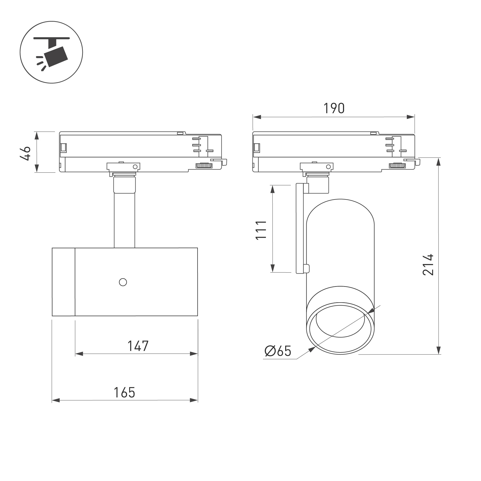 Светильник для треков/шин 4 провода, 18Вт. Управление и изменение цветовой температуры по протоколу DALI. Цвет свечения меняется в диапазоне 2700К - 4000К, световой поток при 2700К - 1120лм, при 4000К - 1300лм, 62лм/Вт, угол 20°, CRI>95. Корпус круглый, алюминий, цвет черный, IP20. Угол поворота светильника -350° (±175°). Угол наклона светового элемента - 308° (±154°). Размеры Ø65x190x220 мм. Входное напряжение AC220-240V, мощность 18Вт. Драйвер встроенный (8-40В, 450мА), пульсация <0.3%