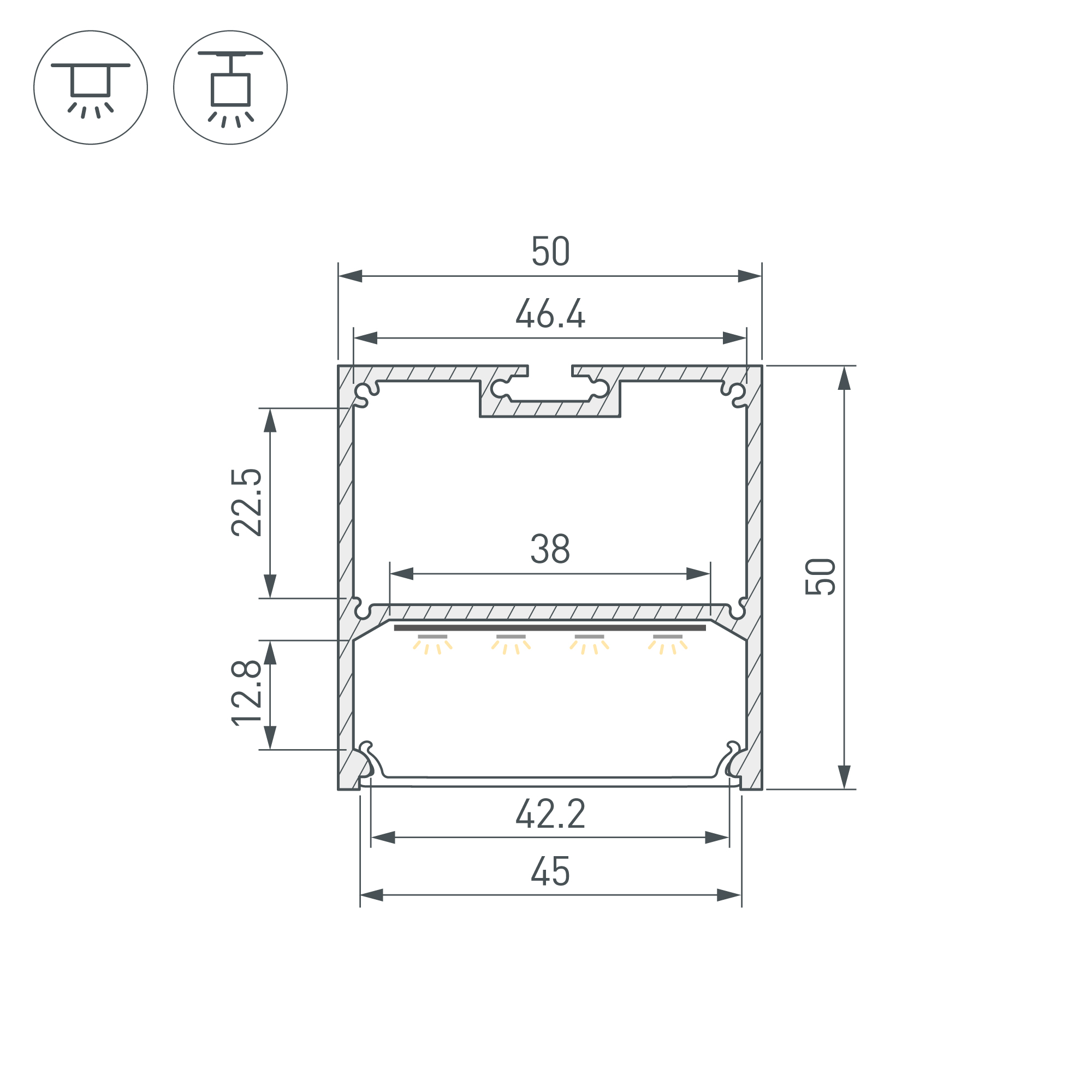 Алюминиевый анодированный профиль для светодиодных лент и линеек. Габаритные размеры (L×W×H): 2000x50x50 мм. Ширина площадки для ленты 38 мм. Отсек для БП 46,4х22,5мм. Экраны, заглушки и другие аксессуары приобретаются отдельно. Цена за 1 метр.