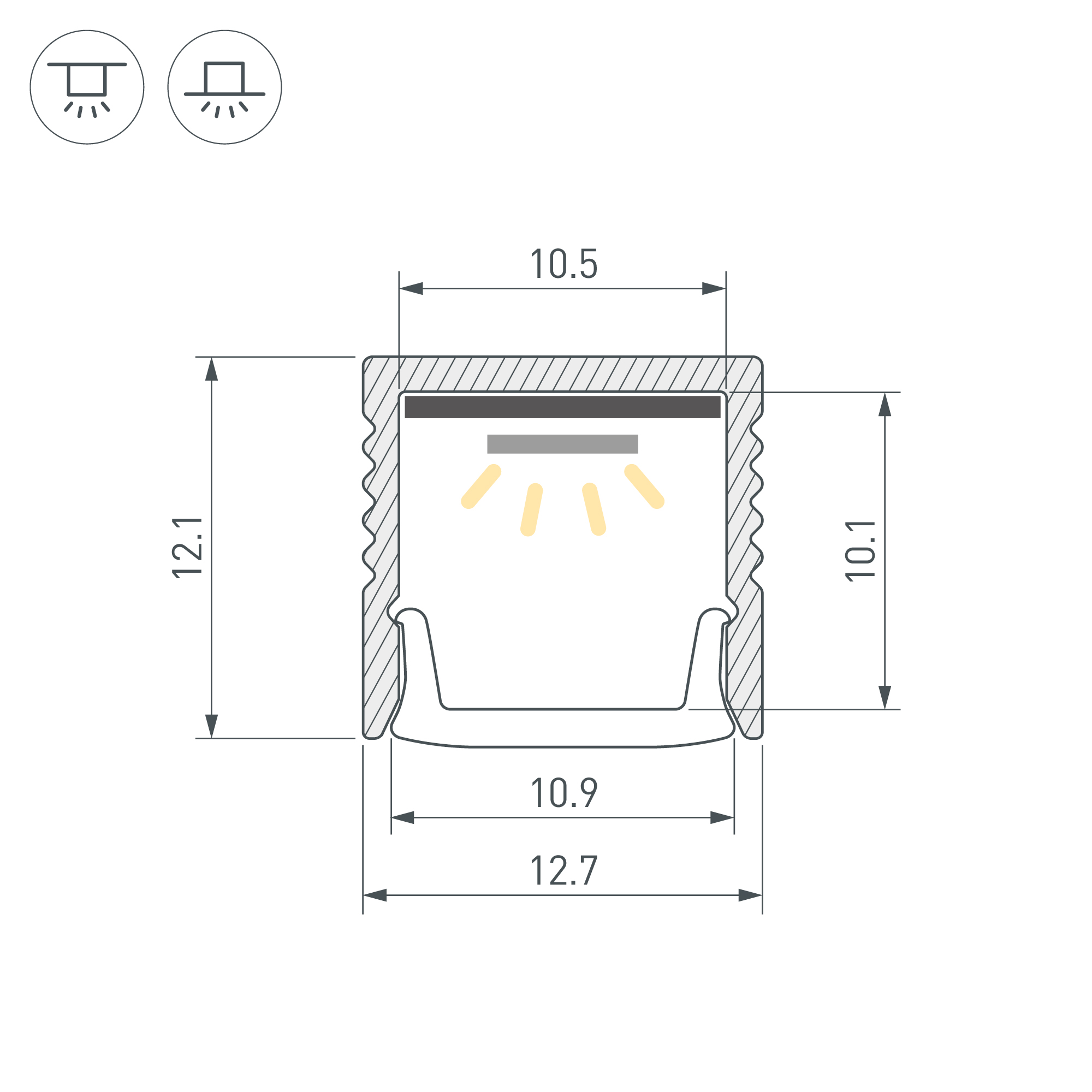Алюминиевый анодированный накладной профиль для светодиодных лент и линеек. Габаритные размеры (L×W×H): 2000x12,7x12,1 мм. Ширина площадки для ленты 10,5 мм. Экраны и заглушки приобретаются отдельно. Цена за 1 метр.