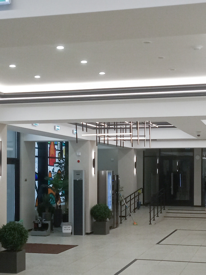 Для декоративной подсветки были выбраны линейные светильники, созданные на базе анодированных профилей и светодиодной ленты белого свечения. Основное освещение реализовано с помощью встраиваемых круглых потолочных светильников и широких световых полос. Основой светотехнического проекта стали лаконичность, минимализм и простая геометрия линий.